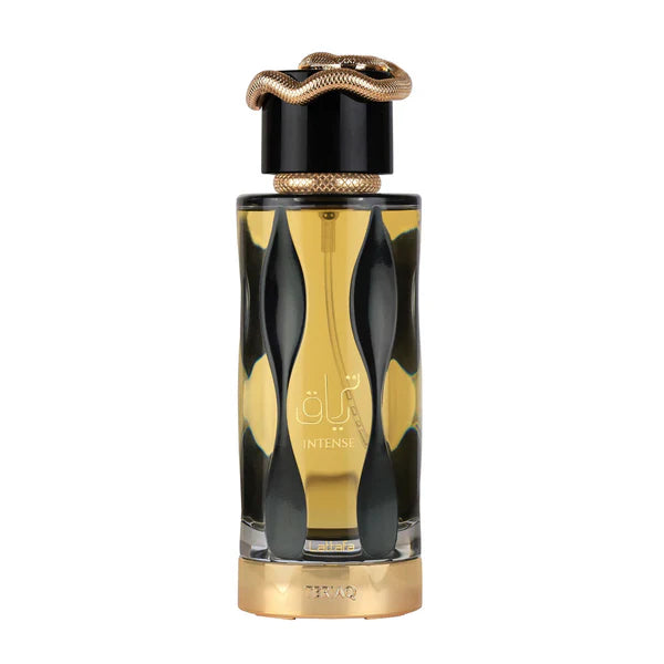 Teriaq Intense van Lattafa is een luxueuze en warme geur die begint met sprankelende tonen van bergamot, verfijnd met de kruidige rijkdom van saffraan. In het hart ontvouwt zich een weelderige melange van sappige pruim, een vleugje likeur en een hint van kaneel, wat de geur een diep, verleidelijk karakter geeft. De basisnoten van romige tonkaboon, warme amber en balsemachtige benzoë zorgen voor een zijdezachte, sensuele afronding die lang op de huid blijft hangen.
